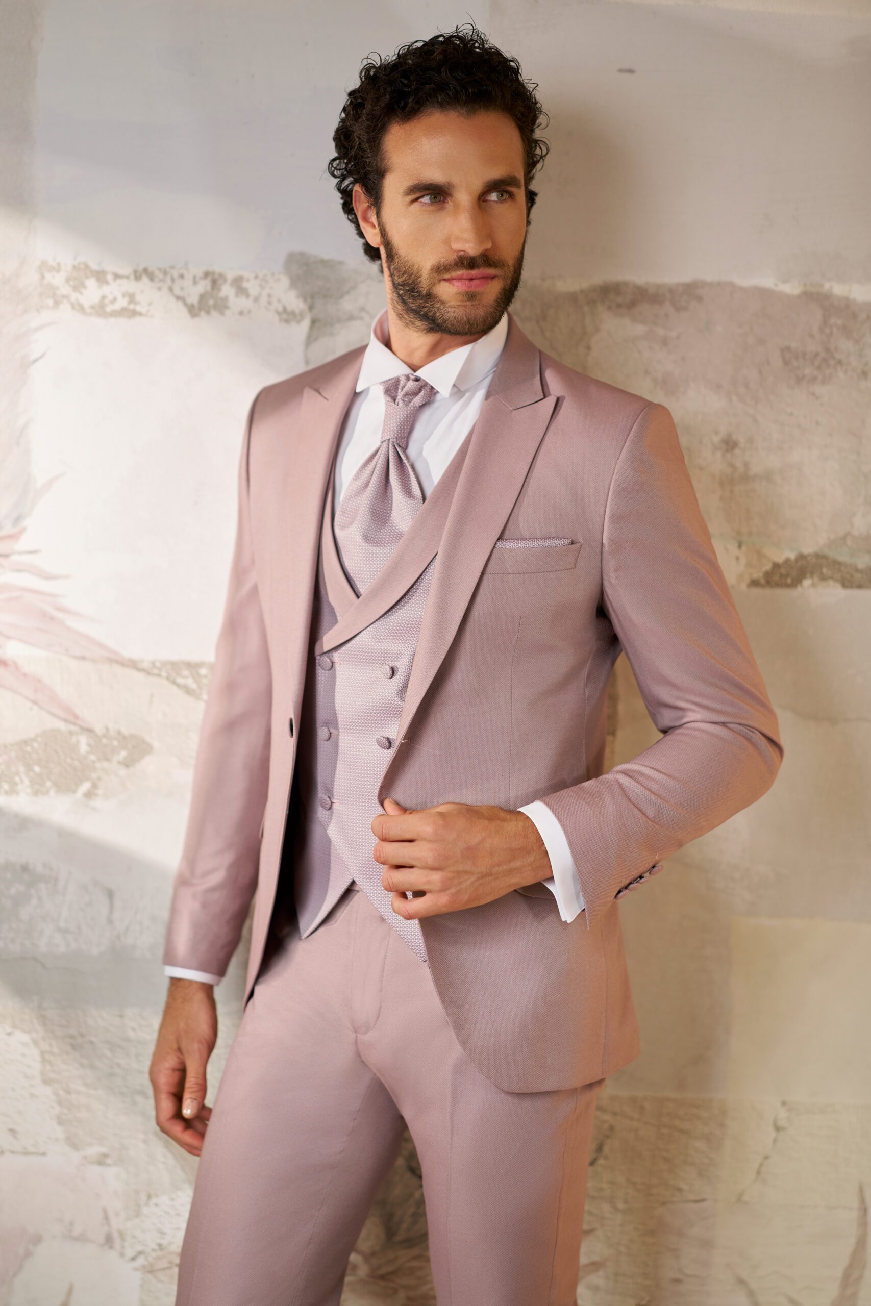 Questo abito in raffinata tonalità rosa si distingue per la sua linea pulita e contemporanea. La giacca dal taglio sartoriale si abbina a un gilet doppiopetto coordinato, che aggiunge struttura e personalità all’insieme.