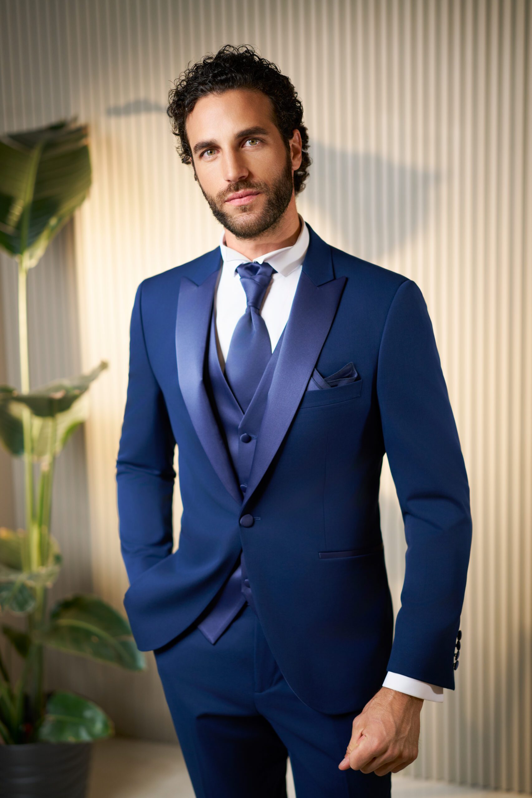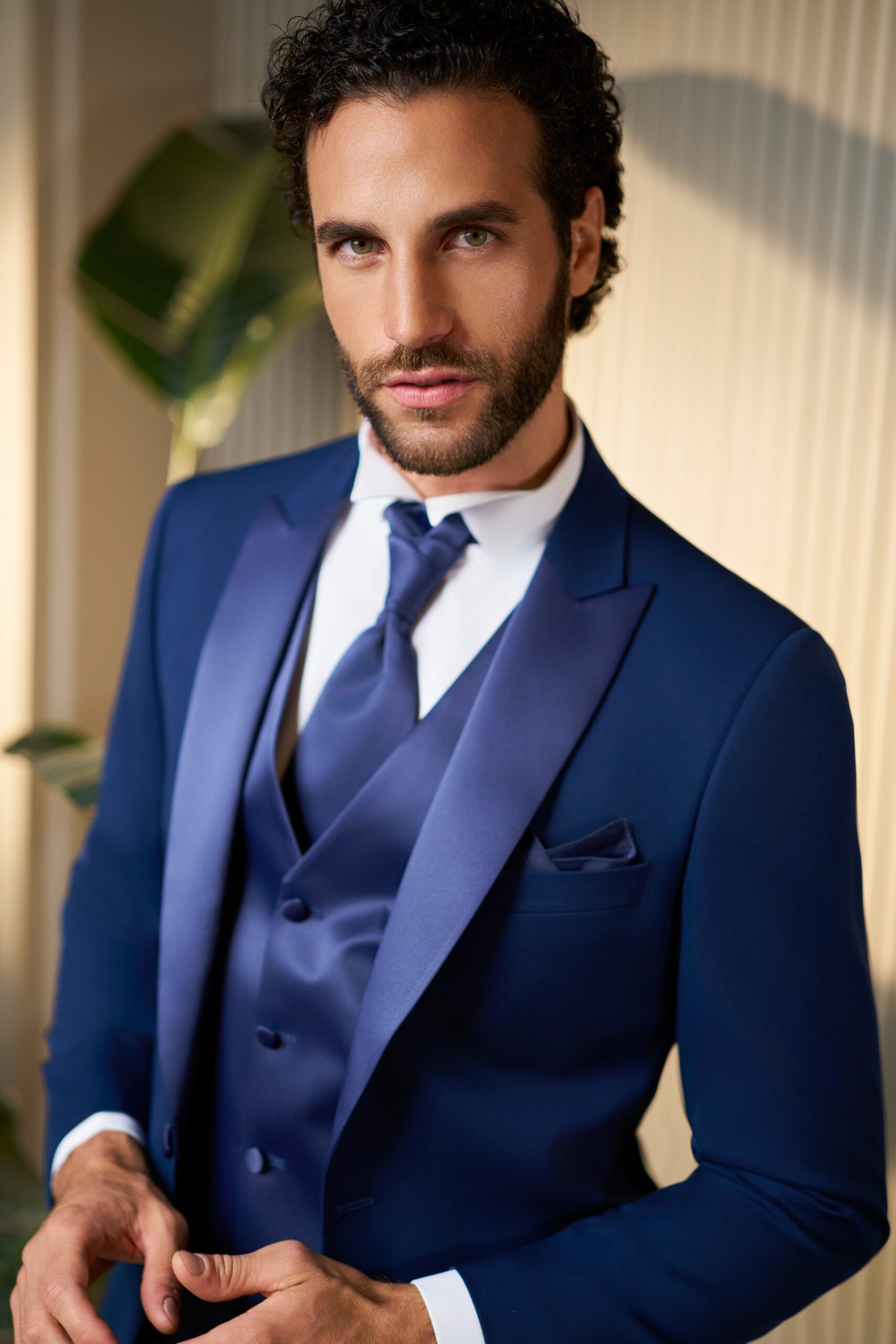 Lo smoking blu notte unisce stile classico e raffinatezza moderna. La giacca con rever in raso valorizza la silhouette con un taglio pulito e sofisticato, mentre il gilet coordinato e il papillon in raso completano il look con coerenza e prestigio.