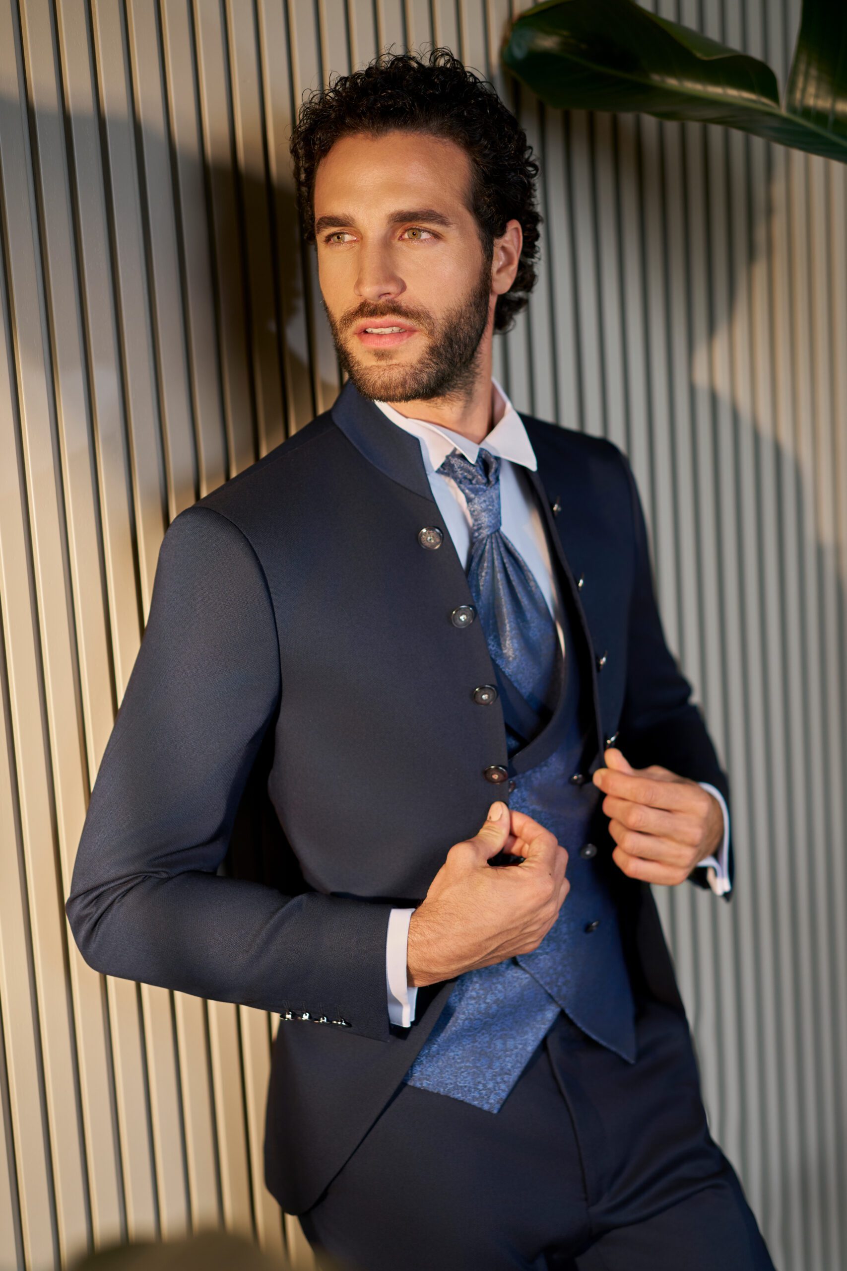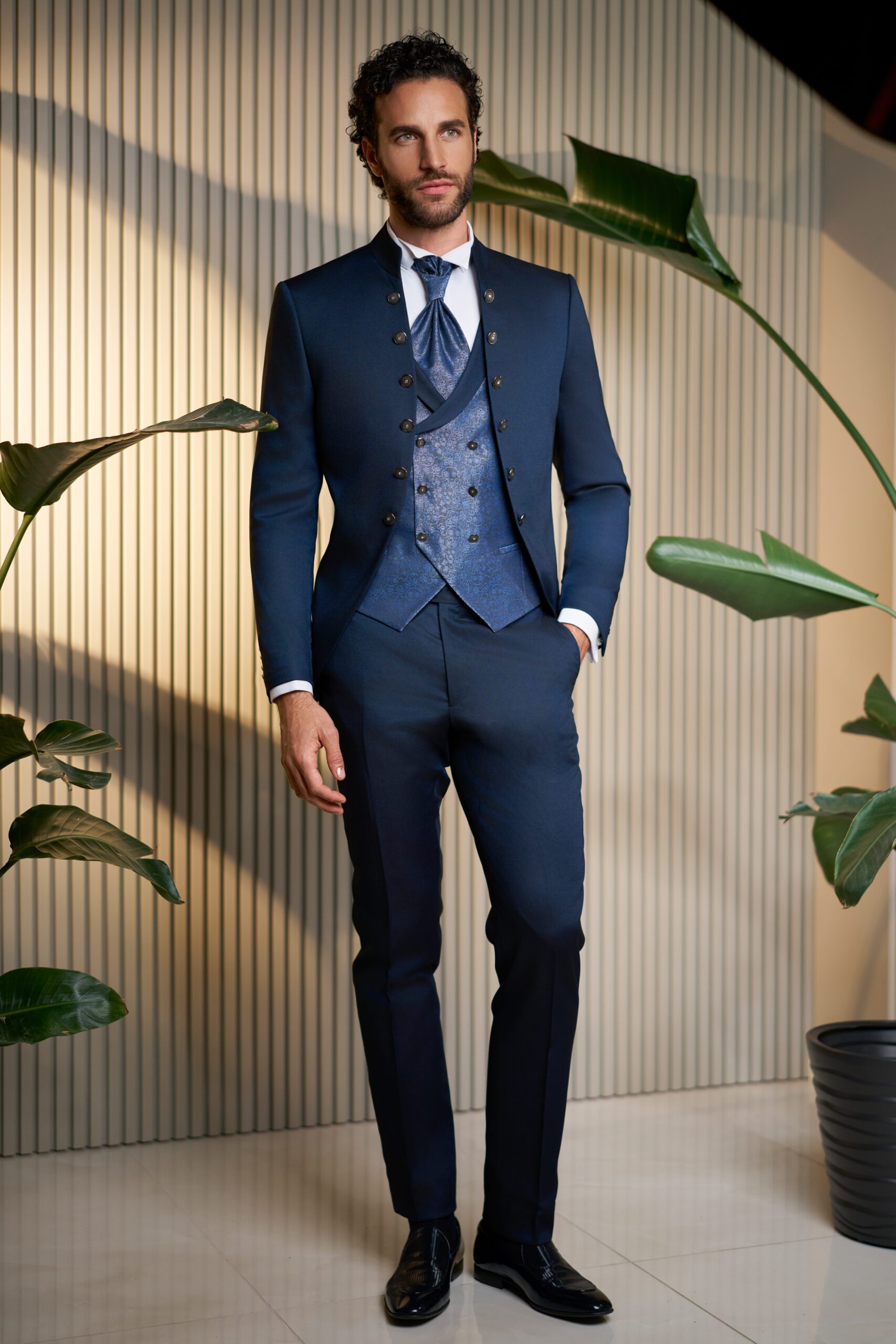 Una giacca stile coreano con bottoni gioiello che cattura subito lo sguardo e dà al look una presenza forte e decisa. Il gilet doppiopetto in damascato leggero blu aggiunge ricchezza visiva e carattere, mentre la cravatta coordinata completa l’outfit con un tocco impeccabile.