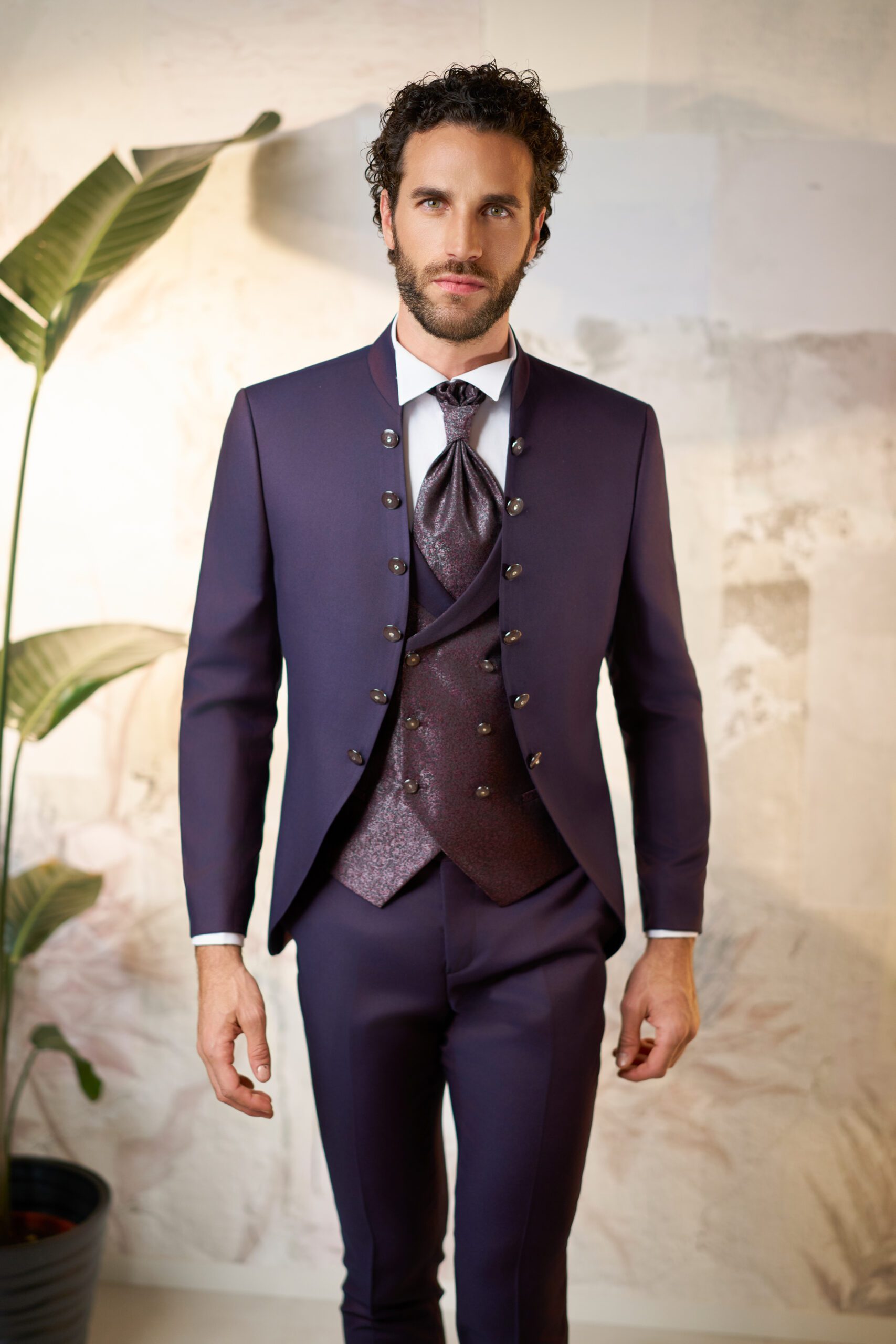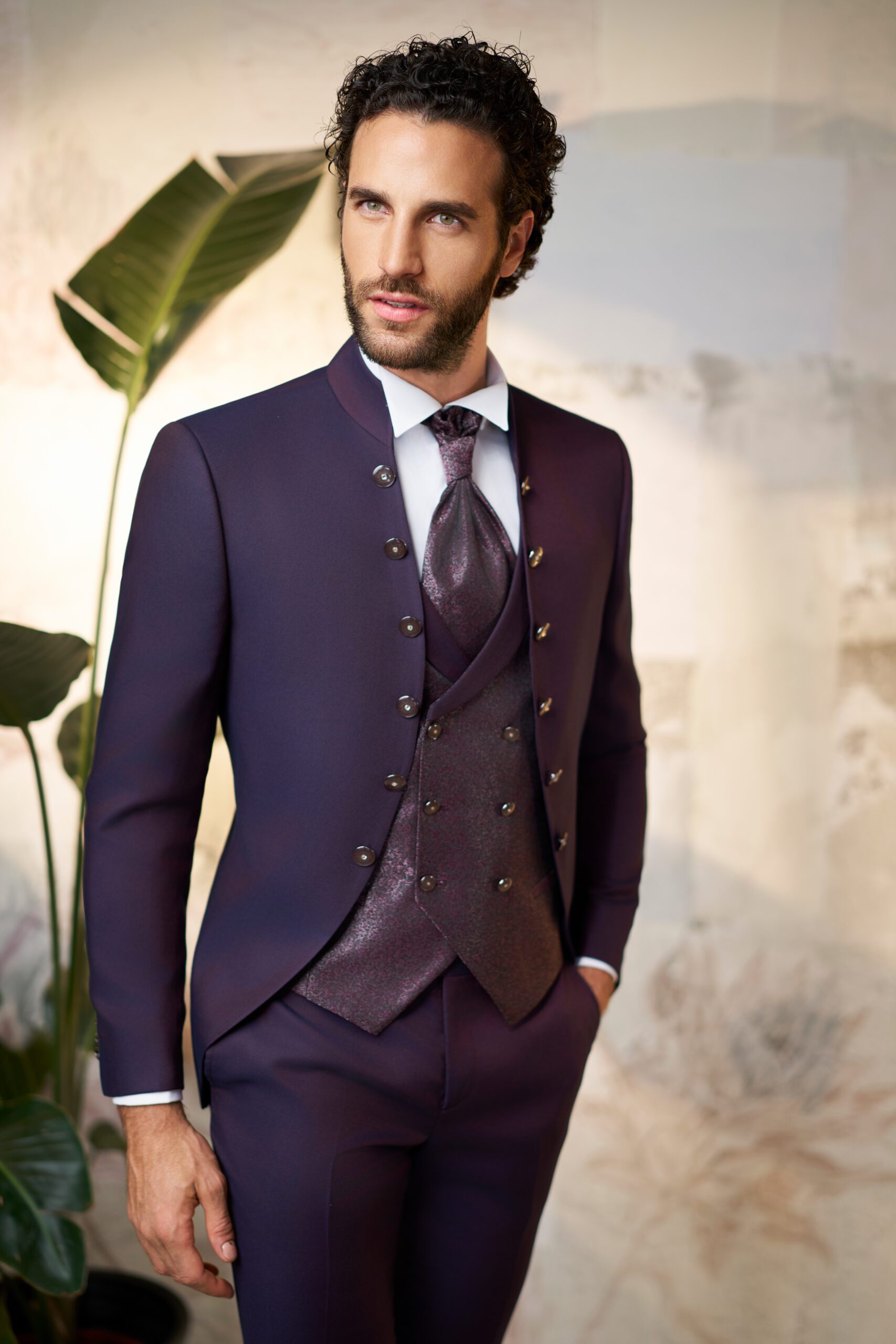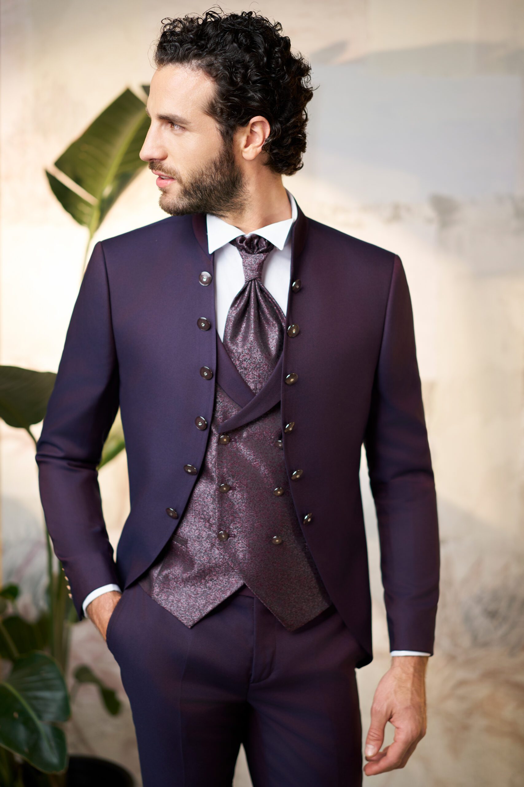 La giacca coreana con doppia fila di bottoni gioiello dona un look deciso e moderno, capace di distinguerti immediatamente in qualunque cerimonia. Il gilet doppiopetto in broccato bordeaux aggiunge profondità e brillantezza, mentre la cravatta coordinata completa l’outfit con un tocco di classe potente.