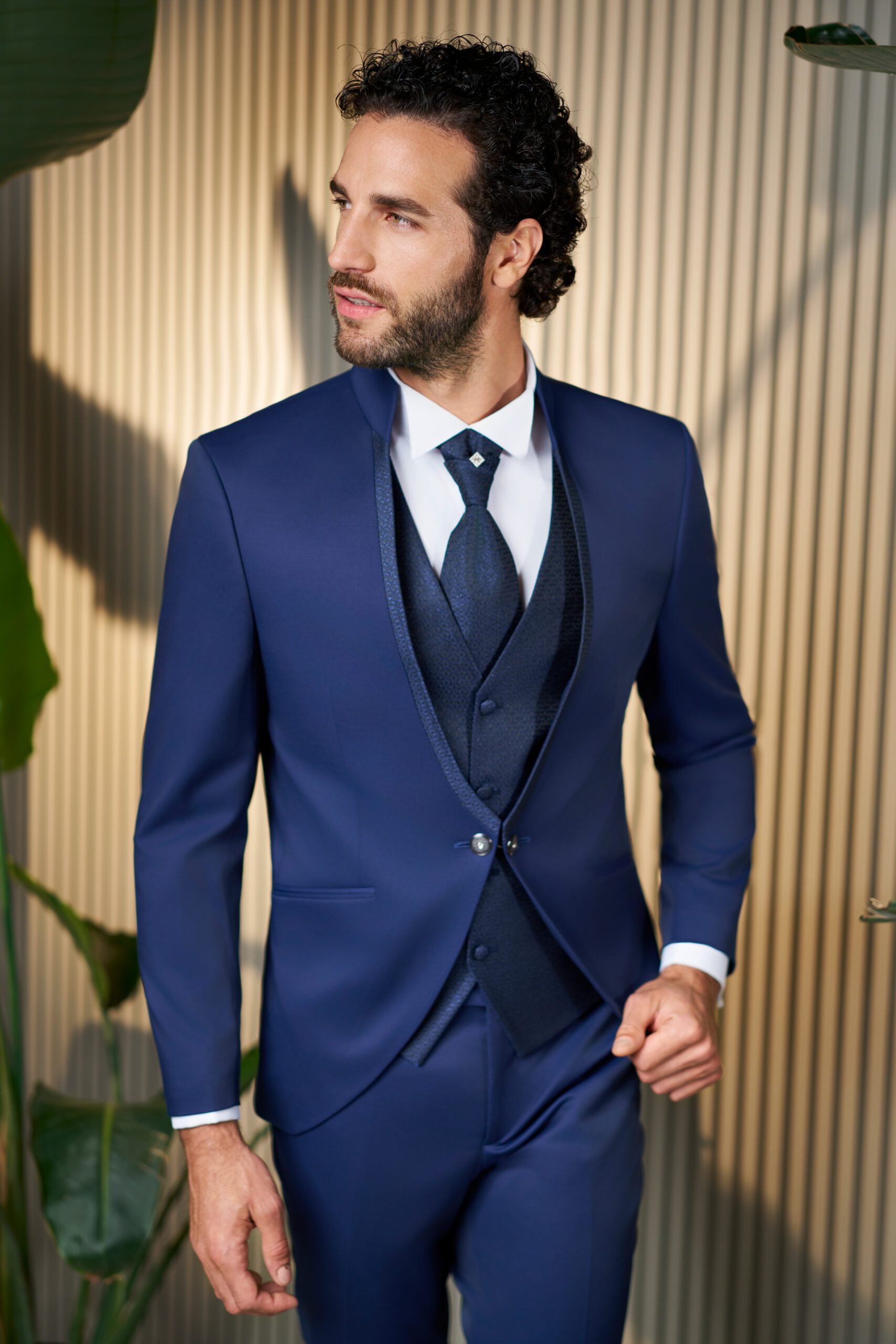 La giacca dal design pulito, con collo in stile coreano e bottoni gemello, dona un tocco moderno e raffinato. Il gilet tono su tono, lavorato con micro-jacquard, aggiunge eleganza e definizione al look, mentre la cravatta coordinata chiude l’insieme con equilibrio e stile.