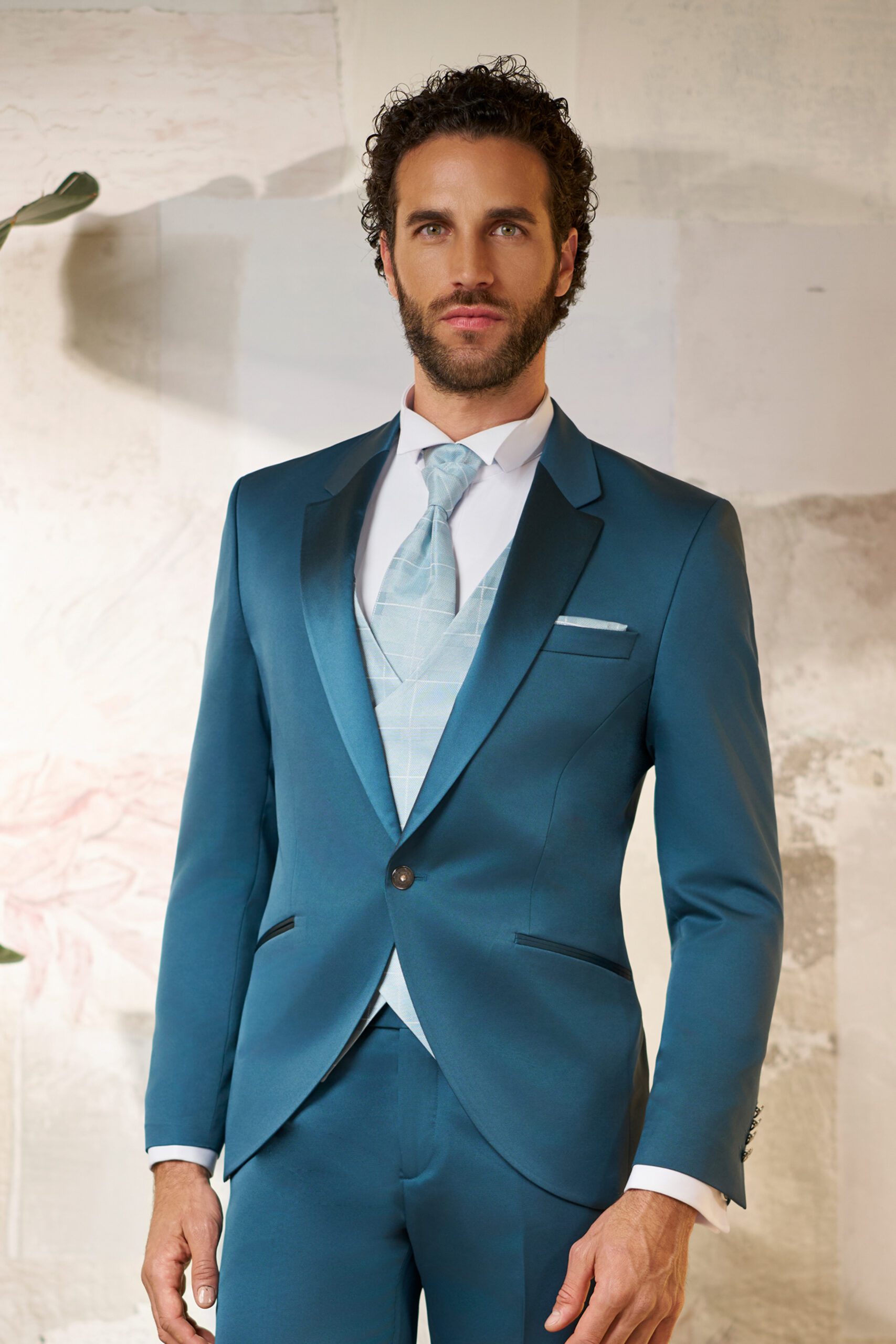 La giacca dal taglio essenziale, impreziosita dal rever in raso, crea un contrasto elegante e luminoso. Il gilet doppiopetto in una raffinata tonalità chiara, con disegno check, aggiunge freschezza e un tocco di stile distintivo. La cravatta coordinata completa l’insieme con armonia e una nota di ricercatezza.