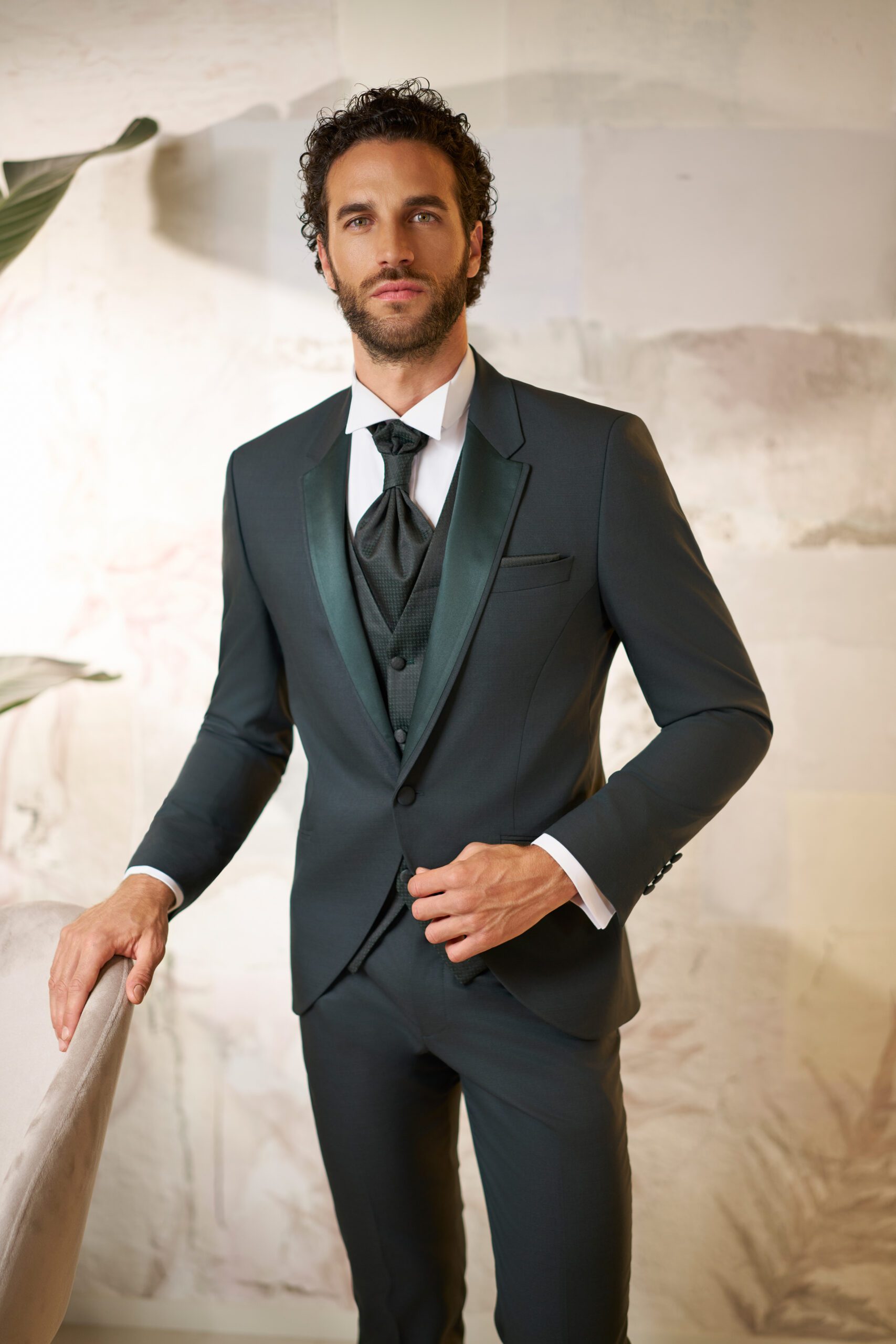 La giacca, impreziosita dal rever in raso tono su tono, crea un effetto sofisticato e contemporaneo. Il gilet con micro-disegno rende l’insieme più ricco e curato, mentre la cravatta coordinata aggiunge un tocco finale armonioso e distintivo.